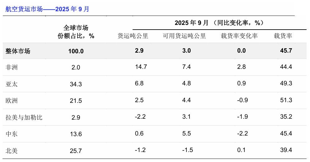 2025年9月航空货运需求增长2.9%发表时间:2025-10-29 21:25来源:国际航协 2025年10月29日,日内瓦 ——国际航空运输协会(IATA,简称“国际航协”)2025年9月全球航空货运市场数据显示: • 总需求(货运吨公里,CTK)同比2024年9月增长2.9%(国际业务增长3.2%)。 • 运力(可用货运吨公里,ACTK)同比2024年9月增长3.0%(国际业务增长4.4%)。 国际航协理事长长威利·沃尔什(Willie Walsh)表示:“9月航空货运需求同比增长2.9%,实现连续七个月增长。这一势头背后,是全球贸易格局的显著调整——美国关税政策(包括取消低值免税待遇)已开始产生影响。一方面,过去五个月北美-亚洲航线的货运需求持续下降;但另一方面,亚洲区内、亚洲与欧洲、非洲与中东航线的强劲增长已足以抵消这一影响。许多人曾担忧全球贸易萎缩,但事实证明,航空货运正成功适应市场结构的转变。” 航空货运运营环境的重要指标: • 8月全球货物贸易同比增长3.7%。 • 尽管原油价格下跌,但由于柴油市场趋紧,航空燃油价差同比翻倍,导致9月份航空燃油价格仍上涨了5.4%。 • 全球制造业景气度9月进一步回升,采购经理人指数连续第二个月上升,达到 51.3;新出口订单小幅改善至49.6,但仍低于50扩张阈值,反映出在关税不确定性下,市场持续谨慎。